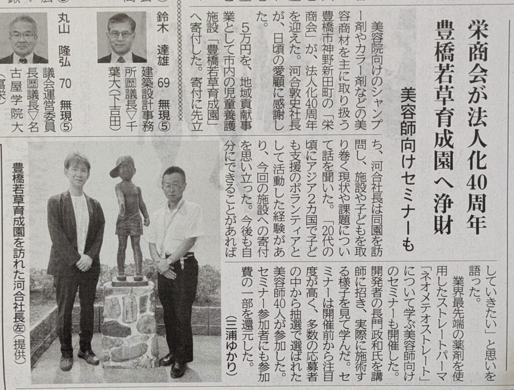 2025年10月25日の東愛知新聞にに若草育成園(児童養護施設)さんへの弊社寄付活動が掲載されました。