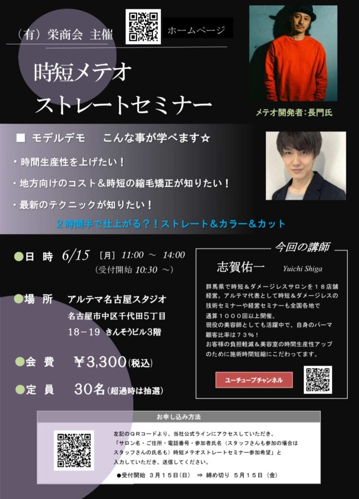 6月15日(月)開催 時短メテオストレートセミナー 6月15日(月)11時より時短メテオストレートセミナーをアルテマ名古屋スタジオにて開催いたします。講師は、アルテマ社長の志賀さんです☆彡皆様からのお申し込みをお待ちしてます!(お申込みは公式ラインから受け付けてます)